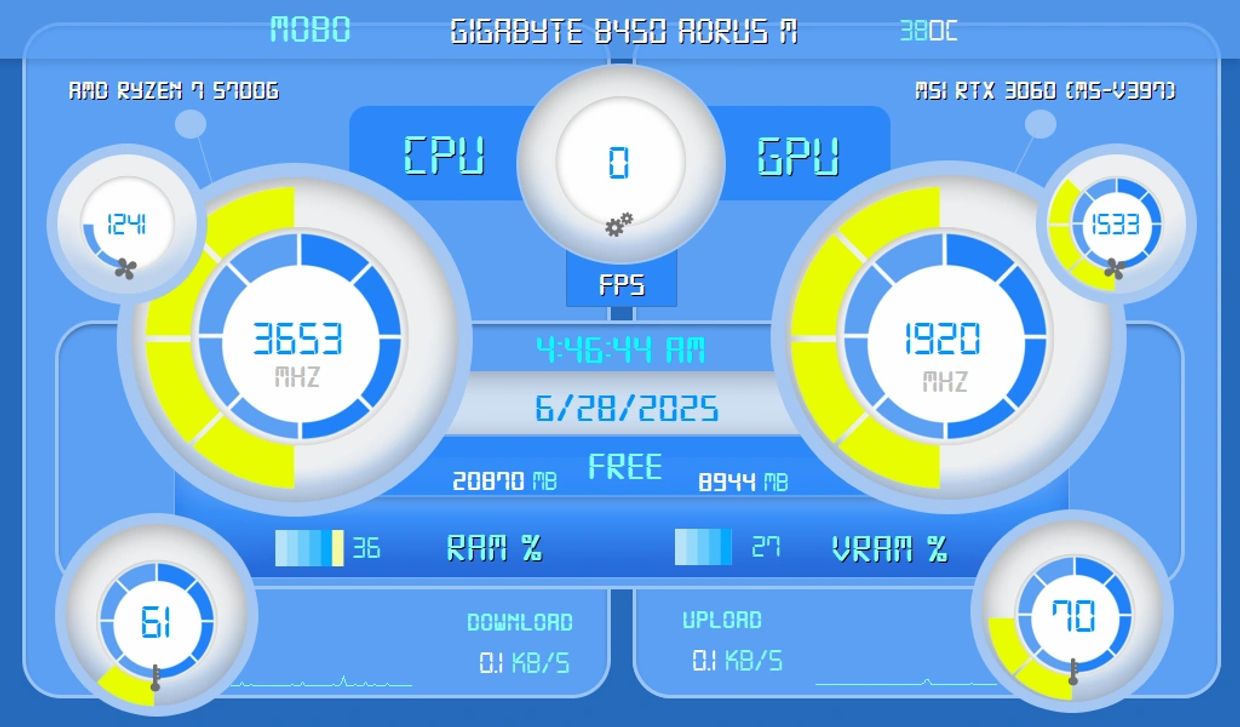 GPU USAGE, GPU CLOCK SPEED ,GPU POWER, CPU USAGE, CPU MULTIPLIER, CPU CLOCK SPEED, MEMORY USED, FREE MEMORY, RAM USAGE, VRAM USAGE, DATE, FPS